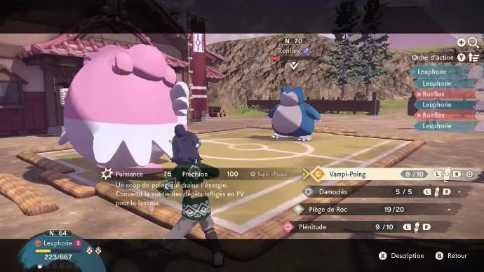 Ronflex va spammer les Damoclès. Il fait très mal mais se blessera également en retour. Je vous invite à utiliser une Plénitude pour augmenter votre attaque et votre défense et de spammer Vampi-Poing.