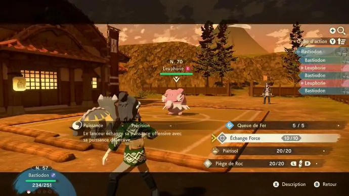 Ce combat est assez rigolo dans sa façon de le réussir. En face, le Leuphorie va se soigner en boucle et votre Bastiodon a une Défense de fou mais une Attaque naze.