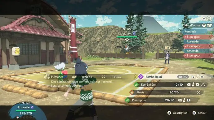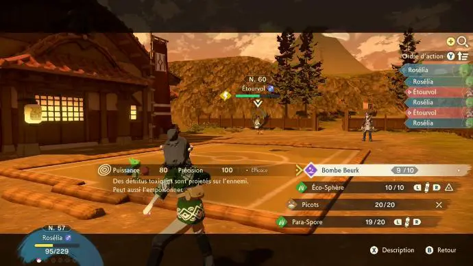 Pour cette quête, le jeu vous conseille d'utiliser vos attaques Plante après un Atterrissage du Étouraptor (car il aura perdu son type Vol). En réalité, je vous invite à le paralyser et à spammer les Bombe Beurk. Si effectivement un Atterrissage est effectué en face, Éco-Sphère est une meilleure option car a une chance de diminuer la Défense adverse.