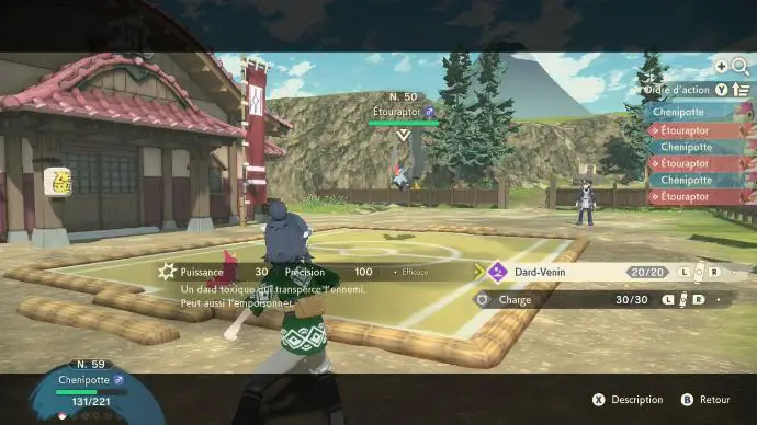 Ce combat est beaucoup soumis à l'aléatoire. De votre côté, vous n'aurez qu'à spammer Dard-Venin en espérant empoisonner l'Étouraptor, car c'est votre poison qui fera le plus de dégâts.