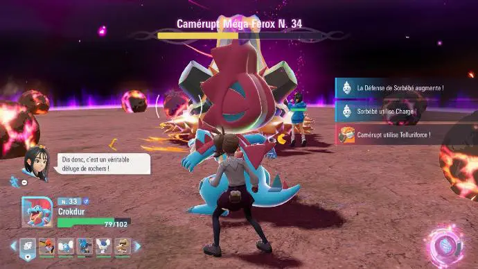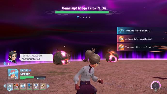 Quelle stratégie adopter pour le combat : Camérupt dispose de l'attaque Telluriforce et vous envoie des rochers, qui seront plus nombreux à la moitié de ses PV. Le Pokémon peut également lancer un rugissement pour éclater les rochers en question, pensez à faire des roulades à ce moment-là. Il a également une attaque d'explosion de boules de feu à moyenne portée donc facilement esquivable.