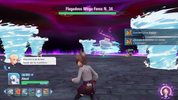 Quelle Méga-Evolution utiliser : Si vous avez pris Germinion en starter, vous allez sortir les feuilles. Si ce n'est pas votre cas, vous pouvez prendre Méga-Élecsprint avec sa gemme obtenable à la tour Quazar contre 180 Méga-Fragments (vous savez, les pierres roses qu'il faut éclater un peu partout en ville). Vous pouvez également prendre le Méga-Absol fraîchement obtenu, ce que j'ai fait.