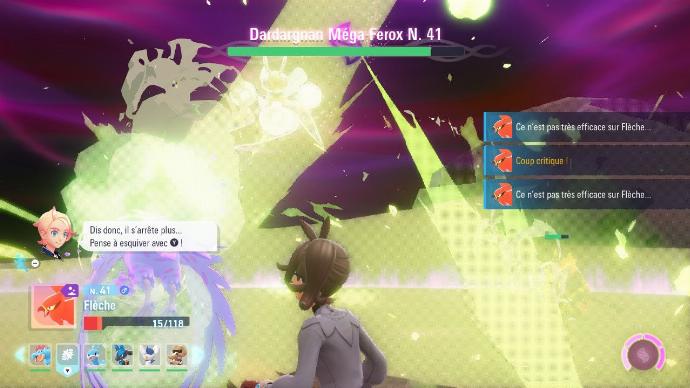 Quelle Méga-Evolution utiliser : Si vous avez pris Gruikui en starter, vous allez le rôtir. Si ce n'est pas votre cas, vous pouvez prendre Méga-Démolosse avec sa gemme obtenable à la tour Quazar contre 180 Méga-Fragments. Vous pouvez également utiliser Lucario comme moi, Dardargnan étant de type Insecte / Poison cela évitera à votre Pokémon de se faire empoisonner (le type Acier ne pouvant pas être affecté par le Poison). Point positif, si Boro/Cety a pris Gruikui vous aurez un très bon soutien pour infliger des dégâts.