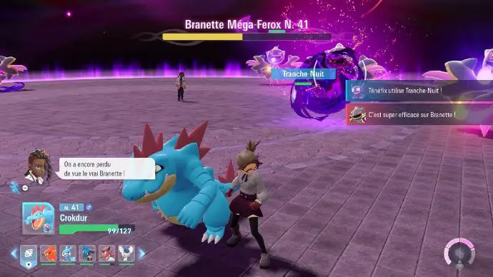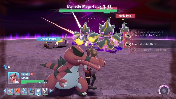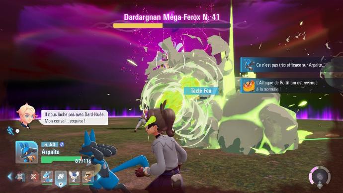 Au cours de votre aventure, vous serez amenés à affronter des Pokémon entourés de Méga-Force, représentée par une aura rose qui virevolte autour d'eux. Si vous avez joué à Pokémon Légendes Arceus, l'affrontement se déroulera un peu de façon similaire aux Pokémon monarques mais sans les boules pacifiantes car le pacifisme c'est surfait à Illumis. Si vous n'y avez pas joué n'ayez crainte, ne paniquez pas face aux combats qui vous attendent et suivez le guide !