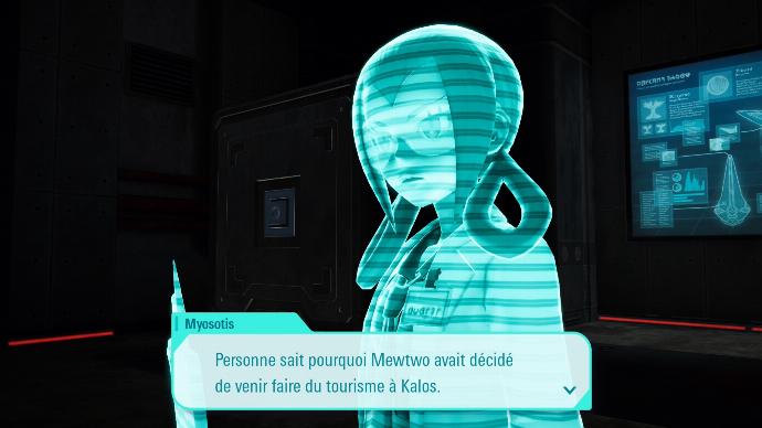 Après avoir usé de 15000 Hyper Ball (ou d'une Master Ball, tel un pro), Myosotis apparait sous forme d'Hologramme et vous raconte un peu le lien entre la Team Flare et Mewtwo.