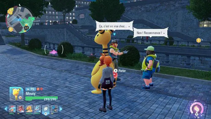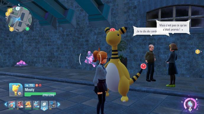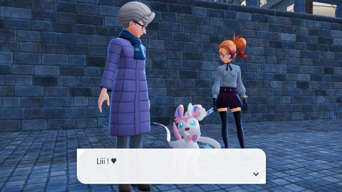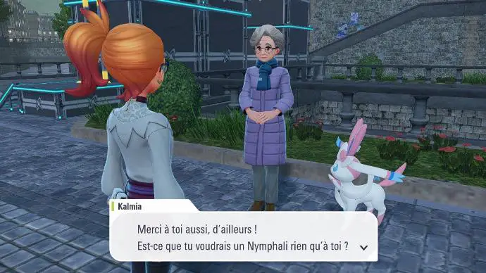 Après avoir interagi avec autant de PNJ, c'est Kalmia qui finit par avoir des ondes négatives autour d'elle et de son Nymphali avant qu'elle se rende compte que s'énerver est inutile. Vous recevez alors 2400 Pokédollars, 1 Grelot Coque et 5 Baies Lonme.