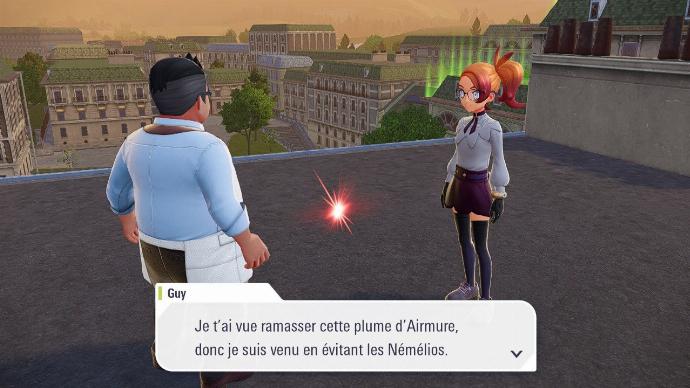 Pour vous faire gagner du temps, allez directement sur le toit du bâtiment grâce à l'échelle afin de vous faire laminer poursuivre par une meute de Némélios. Le scintillement écarlate à vérifier se trouve à côté du Mysdibule Baron qu'il y a habituellement sur le toit. Alors que vous vous apprêtez à faire demi-tour, Guy vous fait la surprise de se téléporter à vos côtés afin de récupérer votre prise. CEPENDANT.
