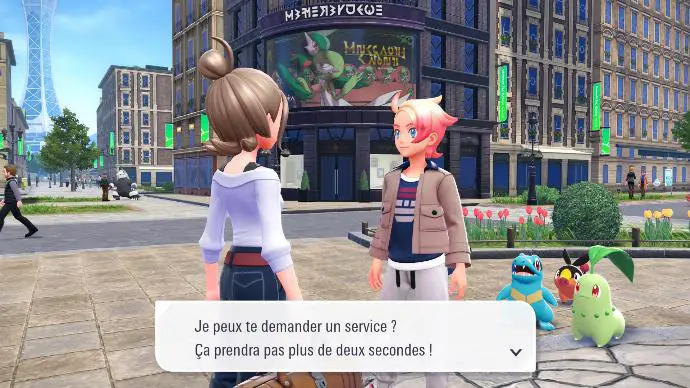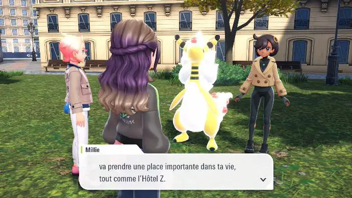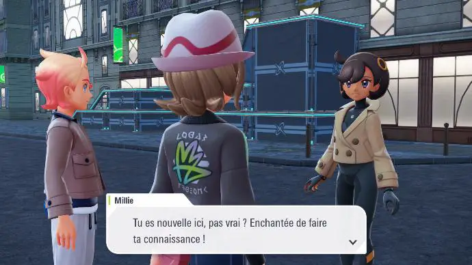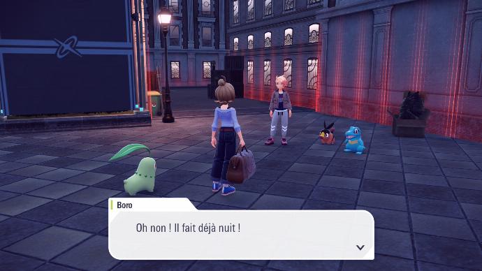 En lançant le jeu pour la première fois, vous êtes accueilli⋅e par le cérémonial désormais célèbre (mais écourté, pour le bonheur de chacun⋅e), qui vous demande d'indiquer votre nom, et de personnaliser votre personnage. Dès la fin de cette étape, vous êtes confronté⋅e à une cinématique, montrant les notables locaux faisant face à la Tour Prismatique, soucieux d'un évènement, manifestement en lien avec la Méga-Évolution.