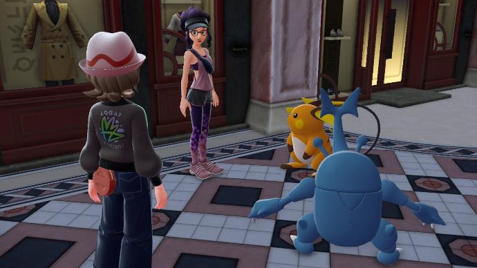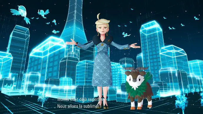 Il dégaine ensuite son Motismart (eh oui, il est de retour.), mais fort heureusement un spot publicitaire sur un écran géant le force à respecter votre droit à l'image. Cette pub met en scène une dénommée Bridjet, de la Société Quazar, et fait office d'introduction au jeu, pour vous expliquer que les Pokémon sont des créatures harmonieuses qui peuplent le monde, vivent dans le mystère avec les humains et tout le discours auquel nos enfances respectives nous ont habitué. Elle présente également le concept des zones sauvages, qui permettent aux Pokémon de vivre en liberté dans Illumis, mais aussi l'holotechnologie, qui est un avatar du late stage capitalism permettant de sublimer la ville par les hologrammes.