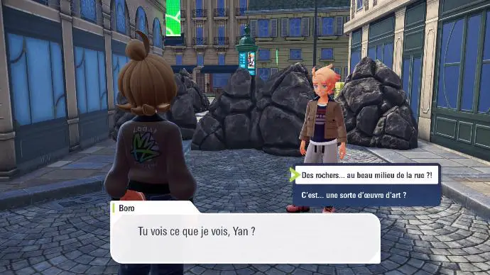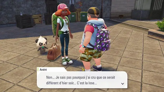 Commencez par poursuivre le Pandespiègle à travers les rues du très cossu huitième arrondissement, jusqu'à tomber sur des brigands, qui ont envoyé leur Pokémon vous voler votre sac. Vous espionnez leur conversation, et apprenez que, confrontés à la laideur de votre sac (???), ils prévoient de le ramener à la police (?????). C'est à ce moment que vous intervenez, avec Boro, votre acolyte qui vous a enfin donné son nom. À la suite d'un échange surréaliste, vous apprenez que vos ennemi⋅es s'appellent Henriette et André. Iels vous proposent de vous restituer le sac en échange d'un combat contre Boro. Celui-ci refuse, et vous propose d'intervenir par vous-même, puisqu'après tout, c'est votre sac. C'est à ce moment que vous pouvez choisir le Pokémon qui va vous accompagner dans ce combat, et dans votre aventure.