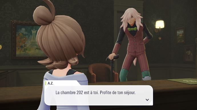 Une fois rentré⋅e dans l'hôtel, vous faites la rencontre de Monsieur A.Z. Il vous dit que votre présence ici n'est pas due au hasard (sans-doute plutôt à un scénario mal-écrit). Il vous intime ensuite de ne jamais trahir votre Pokémon, et vous propose la chambre 202. Boro vous conseille de prendre l'ascenseur, et vous donne rendez-vous le lendemain matin.