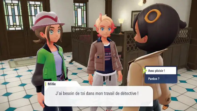 Enfin arrivé⋅e devant l'agence, vous retrouvez Boro, ainsi qu'un Psystigri, apparemment appelé Gribouille. Suivez-les dans l'Agence, pour retrouver Millie, qui est en train de dormir. Elle se (re-)présente, et vous présente Gribouille, qui se trouve être son associé. Ensuite, elle vous propose de l'assister dans son travail de détective, puisqu'il n'y a manifestement que trois habitant⋅es dans cette ville.
