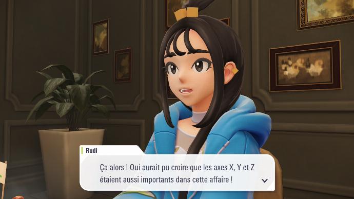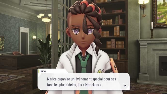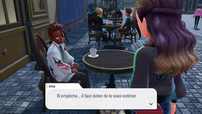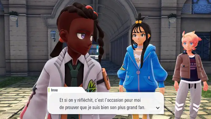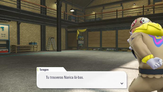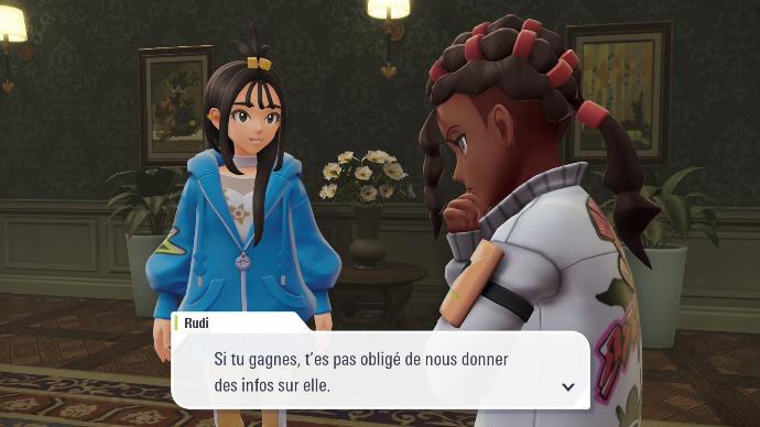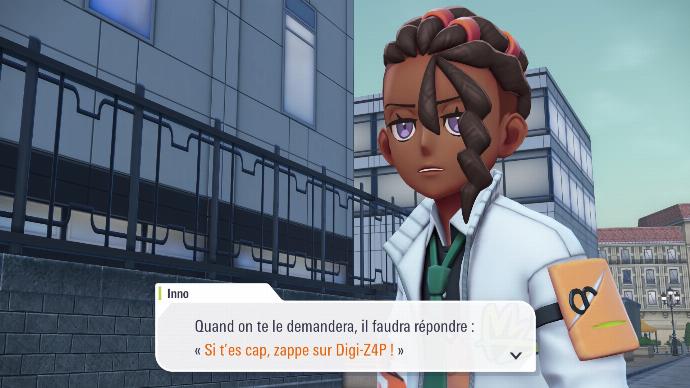 Enfin de retour dans le hall de l'hôtel, vous êtes accueilli⋅e par toute la Team MZ, qui vous explique qu'A.Z. est parti voir la Tour Prismatique. Boro vous félicite de votre succès, et Inno dit tout haut ce que vous pensez tout bas. Mais pas le temps de niaiser, vous recevez une notification de l'application Royale Z-A, qui vous annonce que votre prochain match qualificatif est prêt, et il se fera contre Narica ! Le problème étant de trouver où elle vit, afin de pouvoir gagner votre match qualificatif. Rudi propose que vous affrontiez Inno, afin de le faire parler sur l'endroit où Narica se cache.