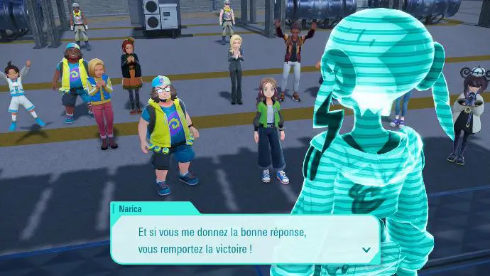 Narica apparaît sous forme d'hologramme devant une foule en délire (enfin une petite douzaine de personnes, en délire). Elle vous rappelle les règles du Nari-Quiz : elle va poser trois questions, et trouver les bonnes réponses permettra d'accéder au round suivant.