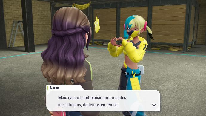 Vous surprenez Narica en plein stream. Elle souhaite d'abord décliner le duel, mais choisit finalement de le livrer pour préserver son e-réputation. Elle vous invite donc dans le garage à son tour. Lorsque vous commencez le combat, son grand-père appelle les ouvriers de son entreprise pour l'encourager.