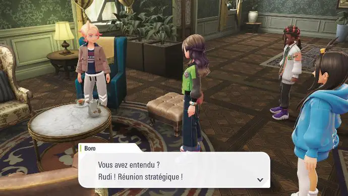 Le lendemain, vous retrouvez la Team MZ dans le hall de l'hôtel. Au milieu d'une conversation sur les Méga-Évolutions Ferox, Musquat vous appelle, pour vous signaler l'apparition de nouveaux Pokémon Méga-Ferox. Boro et Rudi convoquent donc une nouvelle réunion stratégique. Pour débuter la réunion, parlez à Rudi, dans le hall de l'hôtel.