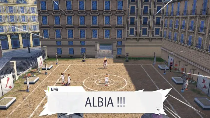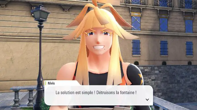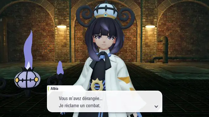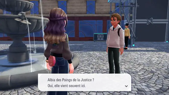 Après votre victoire, Narica vous dit qu'Albia souhaitait partir à un endroit « ou les axes X, Y et Z ne se croisent pas », et devoir vaincre un certain Pokémon dont le type est la faiblesse de son partenaire. Elle s'entraîne donc, mentalement, devant une fontaine à l'effigie de ce Pokémon, ce qui est bien la preuve que Nivis n'est pas le seul membre de sa famille à être zinzin. Nivis vous indique que le partenaire d'Albia est Lugulabre. La fontaine en question est donc la fontaine Gamblast, dans le 7° arrondissement de Valcyan.