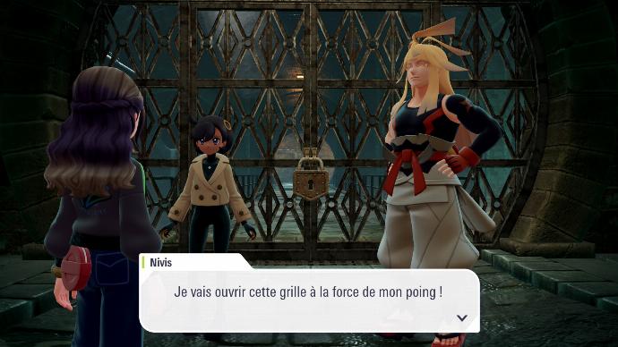 Une fois la fontaine changée en gros glaçon, l'eau se vide. Nivis propose de partir en éclaireur, et vous décidez de le suivre avec Millie. Si vous êtes perdu⋅e, n'hésitez pas à afficher la carte avec le bouton + pour voir comment vous diriger. Au bout des égouts, vous tombez sur une grille fermée à clé, que Nivis propose d'ouvrir à mains nues, quoi que ça veuille dire, avant que Millie ne le dissuade.