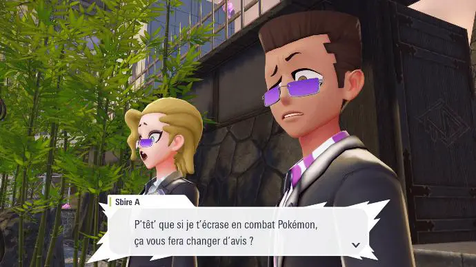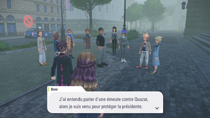 Après les avoir vaincu, vous êtes rejoint⋅es par Corvault, qui fait fuir les représentants de la FRIM, et congédie les enfants. Corvault entame une discussion, mais vous êtes interrompu⋅es par des cris. Vous décidez donc d'aller voir ce qu'il se passe. Vous voyez Bridjet et Boro, en face d'une foule énervée (enfin, 8 personnes, énervées). Ces habitant⋅es soupçonnent la Société Quazar dr'avoir un lien avec la recrudescence de Pokémon sauvages, et Boro, boussole qui indique le sud idéale, a donc décidé de leur venir en aide.