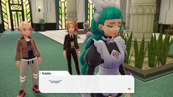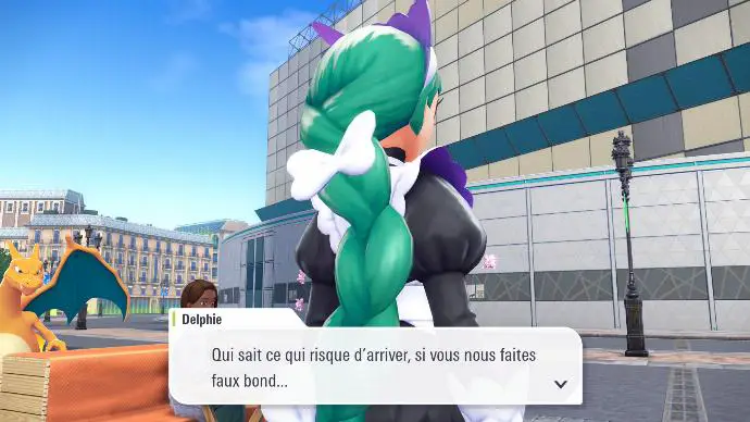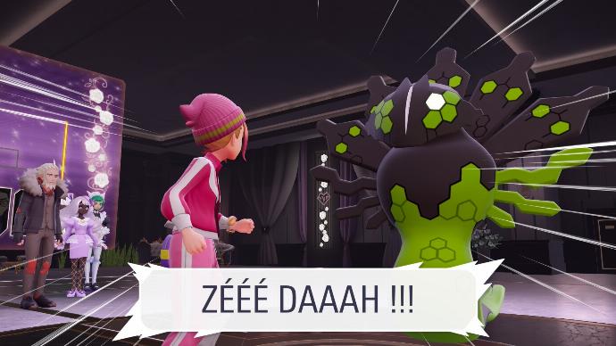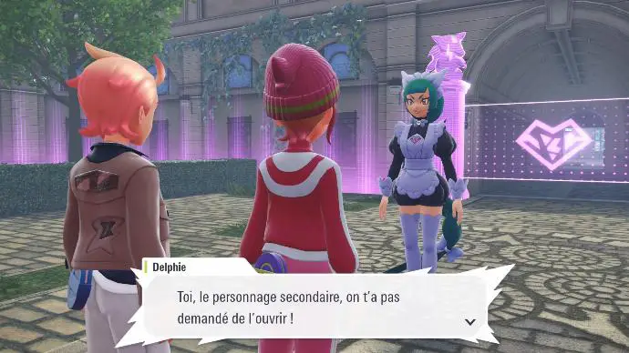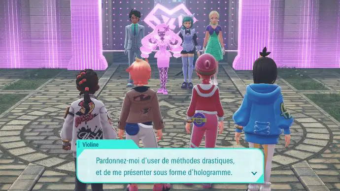 Une fois les trois Pokémon apaisés, vous décidez de rentrer à l'hôtel, où vous concluez qu'il est préférable d'assister au gala, puis vous entendez un bruit. Vous sortez de l'hôtel pour en comprendre l'origine, et constatez que l'hôtel se trouve dans une zone violette. Delphie arrive à ce moment, accompagnée de deux personnes, et de l'hologramme de Violine. Elle vous explique que vous vous situez dans une Zone Violine, et qu'elle n'acceptera de vous libérer que si vous combattez.