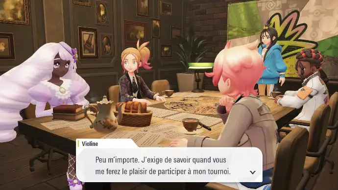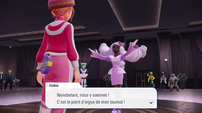Elle vous emmène au terrain de combat de la FRIM, où Narica et Albia vous rejoignent, puis Dame Violine entre en scène. Elle vous appelle à la rejoindre, avec Boro et plusieurs autres dresseur⋅euses, pour les « Grands Jeux de Violine », mais un appel reçu par Boro vous oblige à vous eclipser ; en effet, trois nouveaux Pokémon Méga-Ferox ont été détectés.