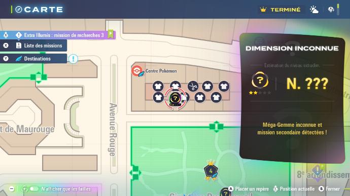 - Les failles "dimension inconnue", en jaune, où vous pouvez réaliser des quêtes annexes. Certaines quêtes vous feront gagner des objets, d'autres des Méga-Gemme. On en parlera dans cette soluce.