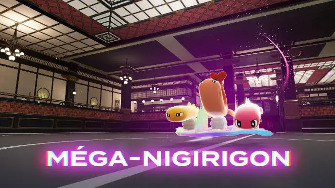 Méga-Nigirigon est de type Eau/Dragon. Des attaques Fée ou Dragon seront très efficace contre lui.