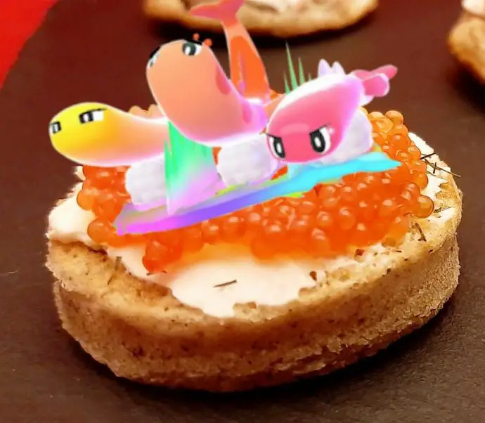 Au milieu du restaurant, un plateau de sushis géants est entouré d'une Méga-Force. Boro/Cety théorise que les sushis peuvent probalement Méga-Évoluer dans Extra Illumis. Sauf qu'en réalité, il s'agissait d'un Nigirigon !