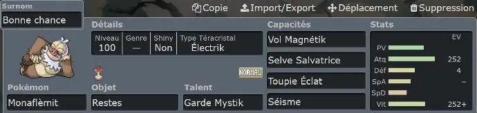 Et maintenant, tentons un truc cheaté au max. Garde Mystik permet à Monaflèmit de ne craindre que les attaques directes de type Combat (sa faiblesse). Le Tératype Électrik permet de transformer cette faiblesse Combat en faiblesse Sol. Vol Magnetik permet d'être immunisé au type Sol. A partir de là, Monaflèmit ne craint plus que les statuts ou attaques indirectes. Avec Selve Salvatrice, il se débarasse des statuts potentiels et se soigne. Toupie Éclat permet d'enlever les Poèges de Roc, Picots etc, et les Vampigraines, en plus d'empoisonner à 100%. En gros, ni les statuts ni les attaques directes ne peuvent mettre K.O. Monaflèmit. Pour se faire, il vous faudra au choix : Requiem, Lien du Destin ou Empoisonnement + Provoc (pour l'empêcher de se soigner). Bonne chance. |